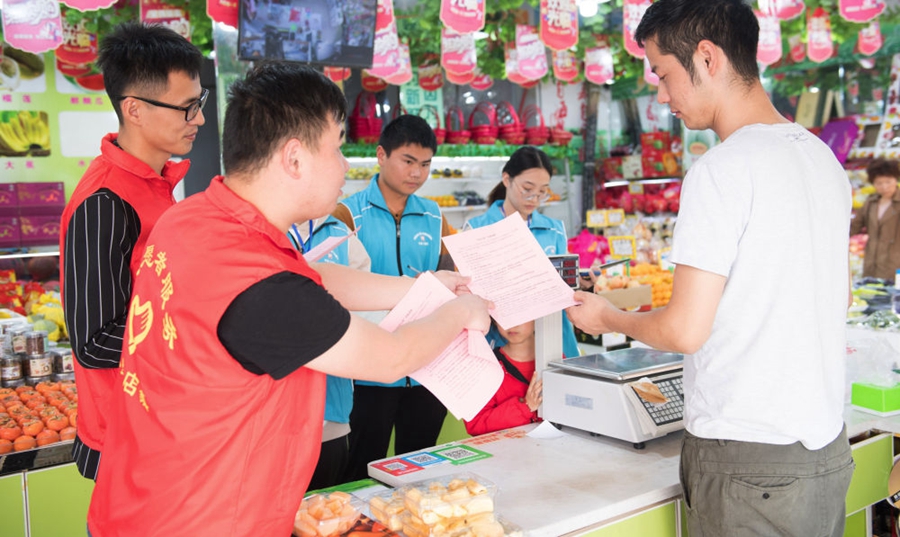 浙江省湖州市吳興區(qū)八里店鎮(zhèn)結合主題教育和“三服務”,推進“民生大走訪”工作機制,全體網格員下沉村、社一線,了解社情民意,化解矛盾糾紛,服務村社群眾。這是八里店鎮(zhèn)中心片區(qū)網格員(藍衣者)和志愿者(紅衣者)對一家店鋪進行平安問卷調查(2019年10月31日攝)。新華社記者 翁忻旸 攝
