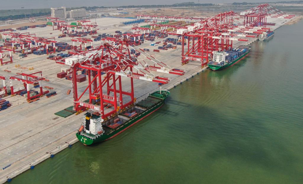 這是2022年7月28日拍攝的廣州港南沙港區(qū)四期全自動(dòng)化碼頭(無(wú)人機(jī)照片)。新華社記者鄧華攝