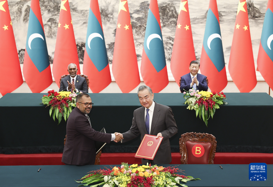 ??1月10日下午,國家主席習(xí)近平在北京人民大會堂同來華進(jìn)行國事訪問的馬爾代夫總統(tǒng)穆伊茲舉行會談。這是會談后,兩國元首共同見證簽署雙邊合作文件。新華社記者 劉彬 攝