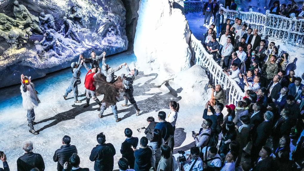 ??2023年10月22日,觀眾在位于貴陽市的“紅飄帶”數(shù)字體驗館內(nèi)觀看體驗長征故事。以長征為主題的數(shù)字體驗館——“紅飄帶”項目利用全息影像、三維聲場等新技術(shù)再現(xiàn)偉大長征。新華社記者 陶亮 攝