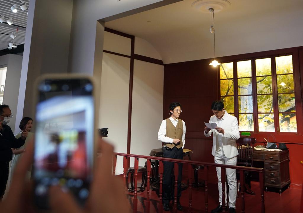 ??2023年5月18日晚,中共一大紀念館原創(chuàng)的情景黨課《又見新青年》在展廳內(nèi)實景演出。自2021年中國共產(chǎn)黨成立100周年之際全新開放以來,中共一大紀念館對紅色文化的創(chuàng)新傳播正不斷“圈粉”年輕人。新華社記者 劉穎 攝