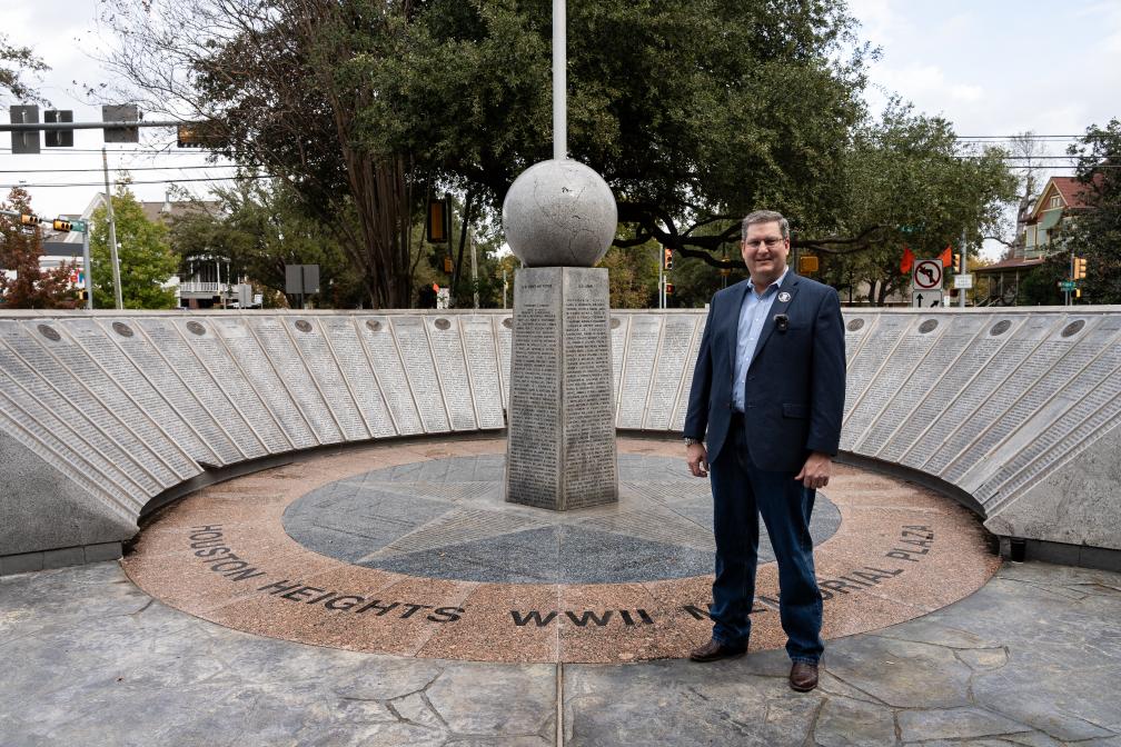 ??2023年12月8日,美國休斯敦市區(qū)的二戰(zhàn)紀(jì)念廣場(chǎng),杜立特突襲者子女協(xié)會(huì)負(fù)責(zé)人戴維·坎滕伯格在紀(jì)念碑前接受新華社記者采訪。