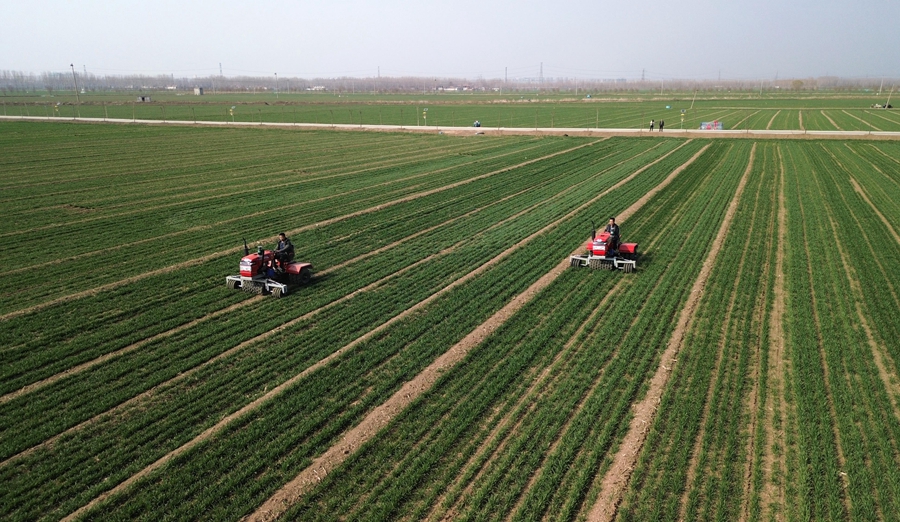 ??山東省汶上縣,農(nóng)民駕駛農(nóng)機在高標(biāo)準(zhǔn)農(nóng)田里進行小麥春季管護作業(yè)(2024年3月13日攝,無人機照片)。新華社記者 徐速繪 攝