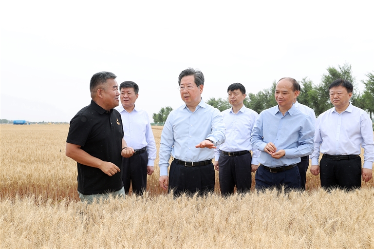 長(zhǎng)葛市石象鎮(zhèn)的高標(biāo)準(zhǔn)農(nóng)田里,金色的麥浪起伏蕩漾,聯(lián)合收割機(jī)穿梭奔忙,一派燦爛豐盈的喜人景象。樓陽(yáng)生走進(jìn)麥田、揉開(kāi)麥穗,察看麥粒飽滿(mǎn)程度,與農(nóng)戶(hù)、農(nóng)機(jī)手親切交流,了解播種面積、麥?zhǔn)者M(jìn)度、收成收入等。他指出,春爭(zhēng)日、夏爭(zhēng)時(shí),要密切關(guān)注天氣變化,搶抓麥?zhǔn)沼欣翱谄?,加?qiáng)跨區(qū)機(jī)收組織調(diào)度,提升機(jī)械化、智能化水平,確保應(yīng)收盡收、顆粒歸倉(cāng)。在河南鼎優(yōu)農(nóng)業(yè)科技有限公司,樓陽(yáng)生走進(jìn)新品種展示中心,了解玉米、瓜果、蔬菜等新品種培育種植情況,鼓勵(lì)企業(yè)不僅要培優(yōu)種好新品種,還要往深加工走,拉長(zhǎng)產(chǎn)業(yè)鏈、提高附加值。在聽(tīng)取企業(yè)人才引育情況匯報(bào)后,他指出,發(fā)展現(xiàn)代農(nóng)業(yè)離不開(kāi)一支高素質(zhì)農(nóng)業(yè)從業(yè)者隊(duì)伍,要加強(qiáng)產(chǎn)業(yè)扶持、政策支持,培育引導(dǎo)更多愛(ài)農(nóng)業(yè)、有知識(shí)、懂技術(shù)、善經(jīng)營(yíng)的新農(nóng)人,投身農(nóng)村廣闊天地大展身手。