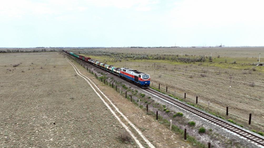 ??2023年5月12日,在哈薩克斯坦阿拉木圖附近,貨運(yùn)列車馳騁于阿拉木圖與中國(guó)霍爾果斯間(無(wú)人機(jī)照片)。新華社發(fā)(奧斯帕諾夫攝)
