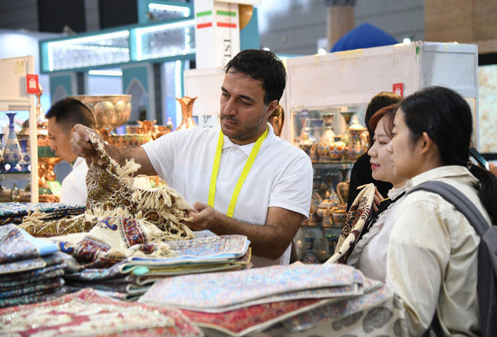 ??2024年9月20日,在陜西省西安市舉行的第八屆絲綢之路國(guó)際博覽會(huì)上,來(lái)自伊朗的參展商(前左一)向觀眾介紹產(chǎn)品。 新華社記者 張博文 攝