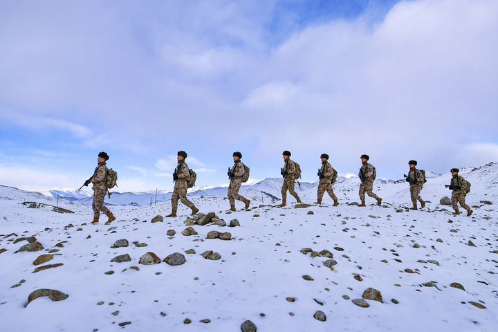 2024年2月9日,駐守帕米爾高原的新疆軍區(qū)某邊防團(tuán)紅其拉甫邊防連官兵踏雪巡邏。